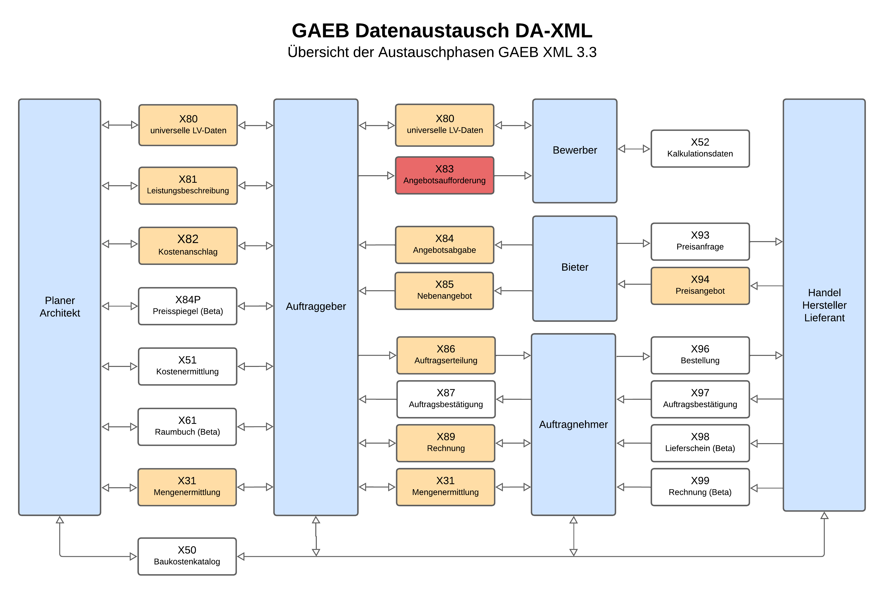 Der GAEB-Standard definiert den gesamten Ausschreibungs- und Abrechnungsprozess in logischen Schritten, den sogenannten Austauschphasen. Jede Phase wird durch eine zweistellige Nummer (z. B. 83) und eine führende Kennung für das Format (z. B. „X“ für GAEB DA XML) gekennzeichnet.